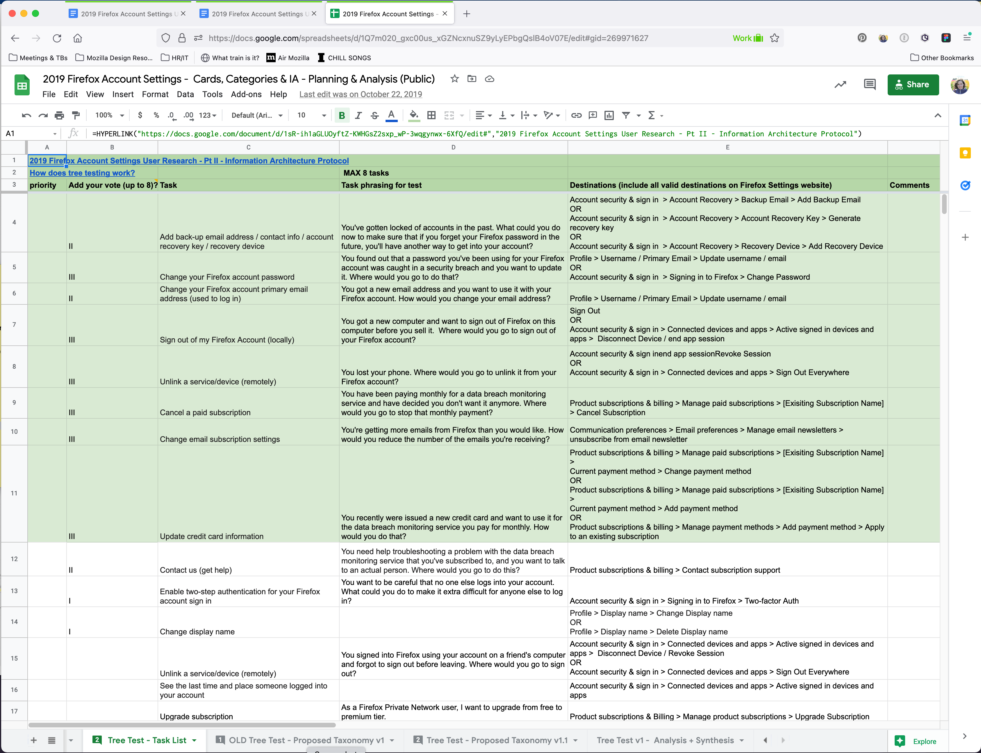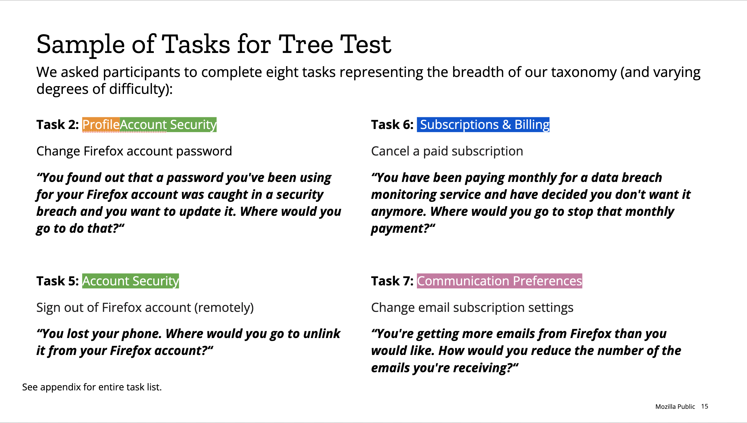 After making adjustments to our high-level buckets and labels based on the closed card sort test findings, I evaluated the usability of the proposed taxonomy with a series of tasks the participants were asked to complete using a tree test. Firefox Account Settings - Information Architecture User Research - Tree Test Results (Public)