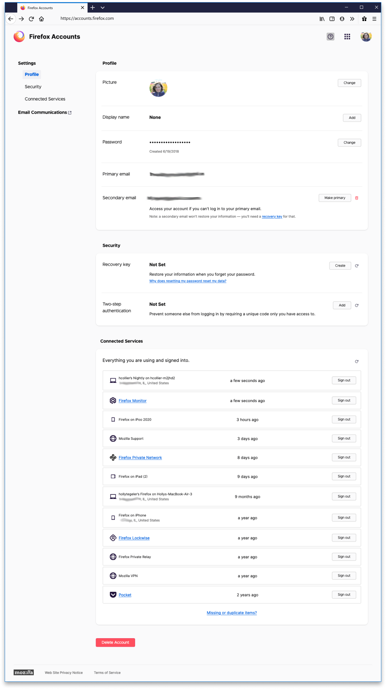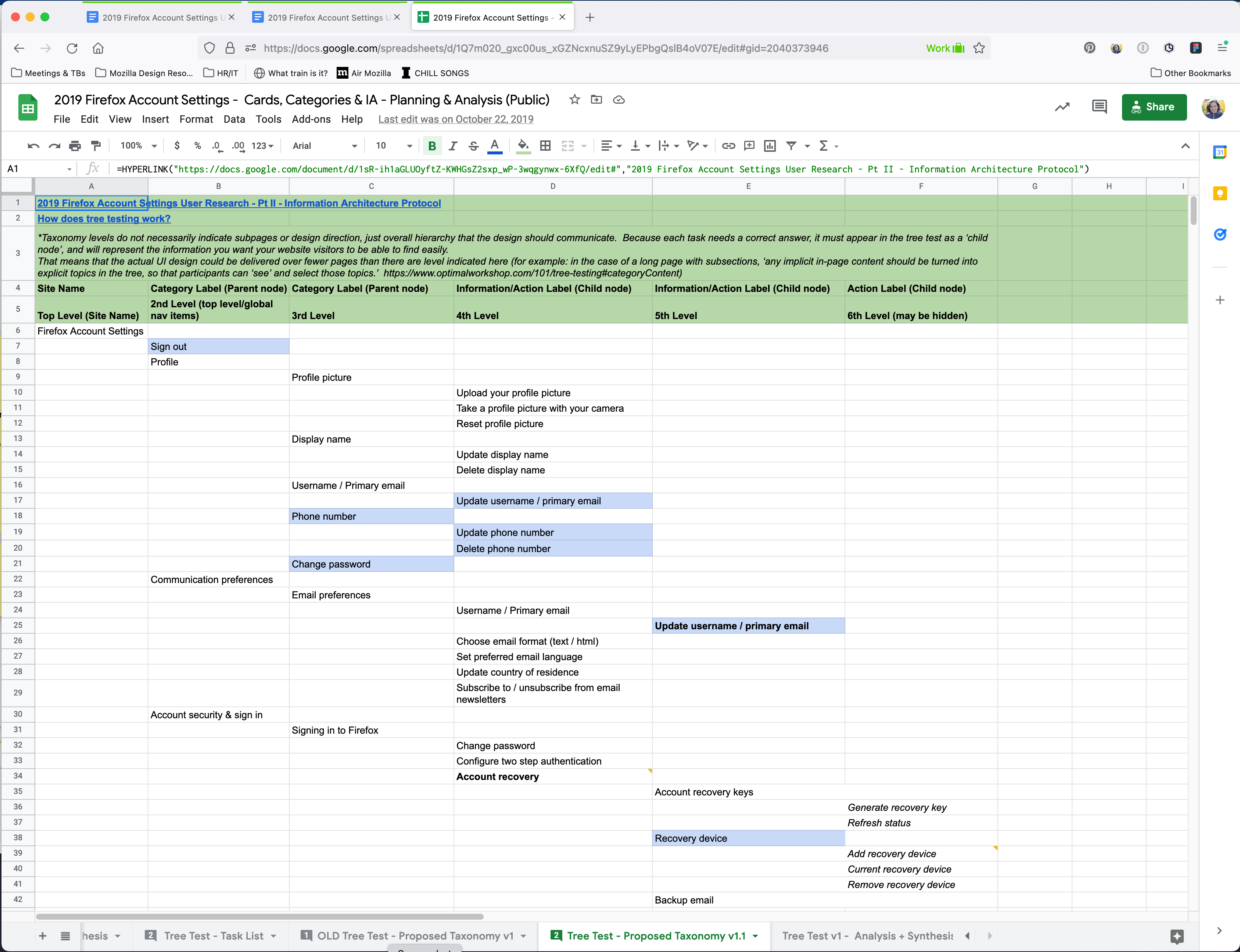 The recommended information architecture, for the Firefox Account settings website, based on several rounds of research I conducted, went live in early 2021.Like most research done by the Firefox UX team (https://firefoxur.github.io/), the research I conducted is public, and you can read my detailed research plan, protocol & findings: