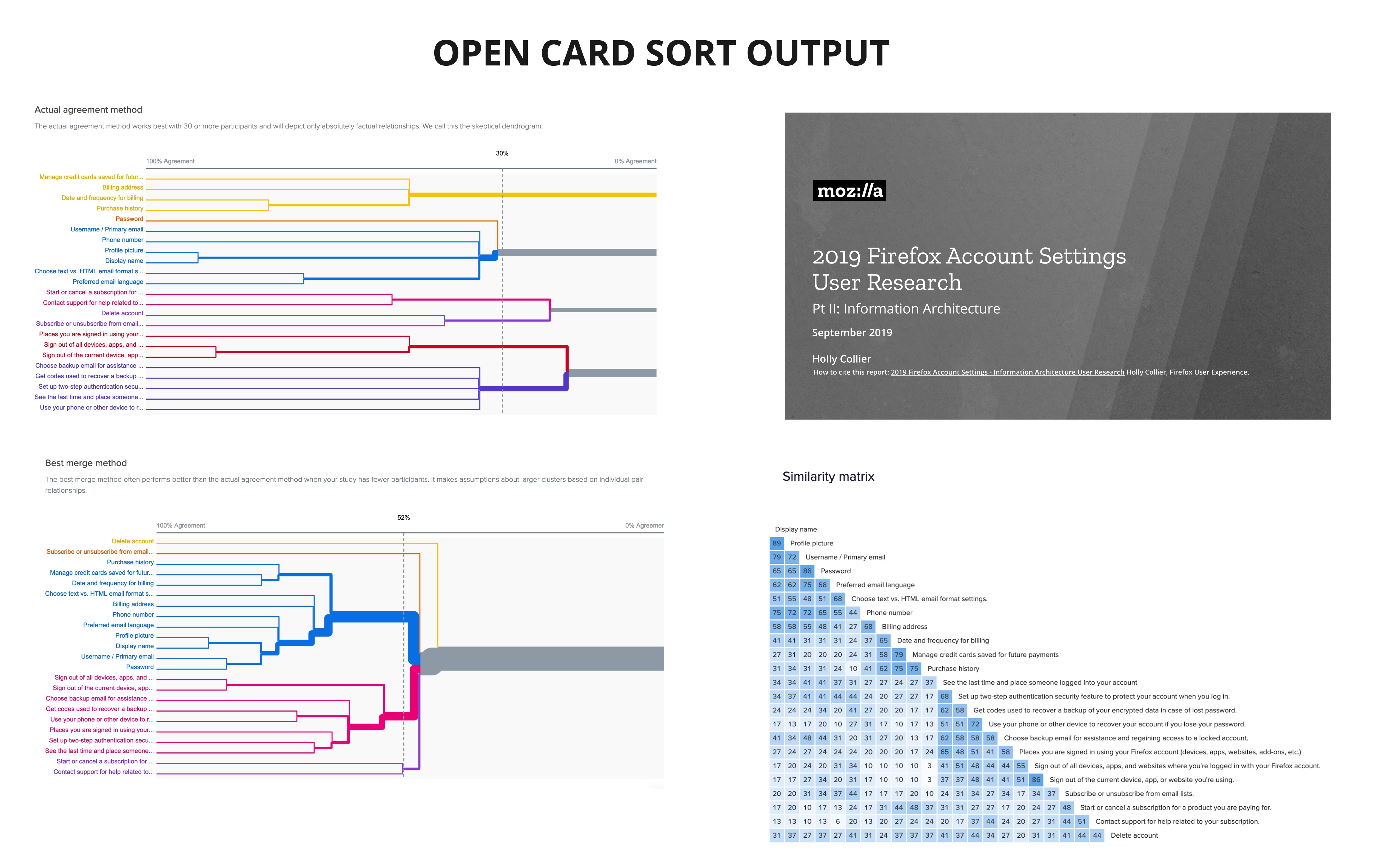 The design process for the Firefox Account settings redesign began with a competitive analysis to provide us with inspiration (how were other product ecosystems handling their account settings?). At the same time, we wanted to make sure that our new structure matched users’ current mental models, so we kicked off a 3-part IA research study to inform the its design.The study had two main goals: