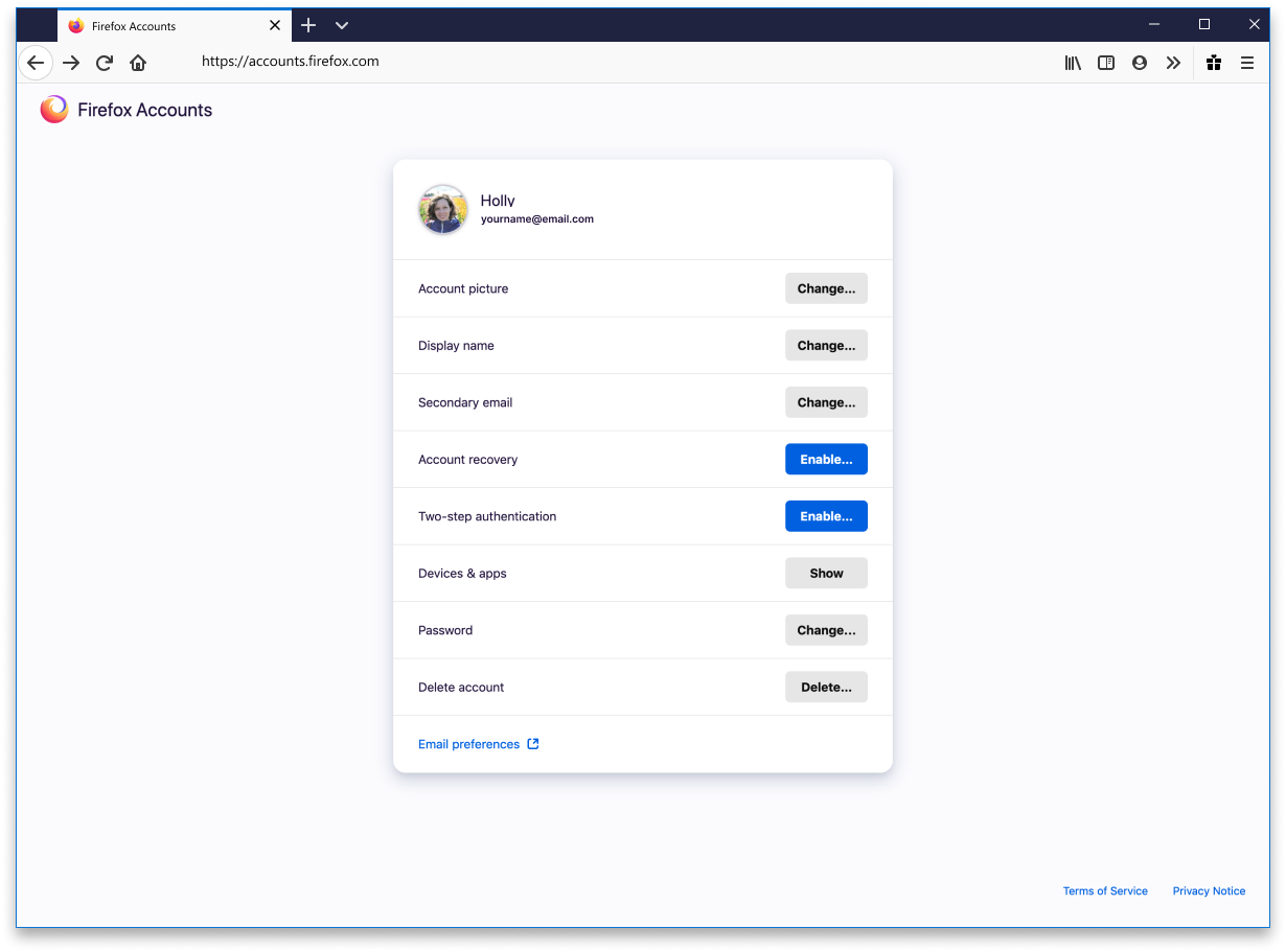 Firefox Accounts (now Mozilla Accounts) is the identity and authentication service used by the Firefox browsers, as well as other products in the Mozilla ecosystem, and the Firefox Account settings website (accounts.firefox.com) is the center of that. It allows Firefox Account holders (regardless of the browser or products they use) to manage their global Firefox Account settings, including but not limited to email, password, and synced devices.