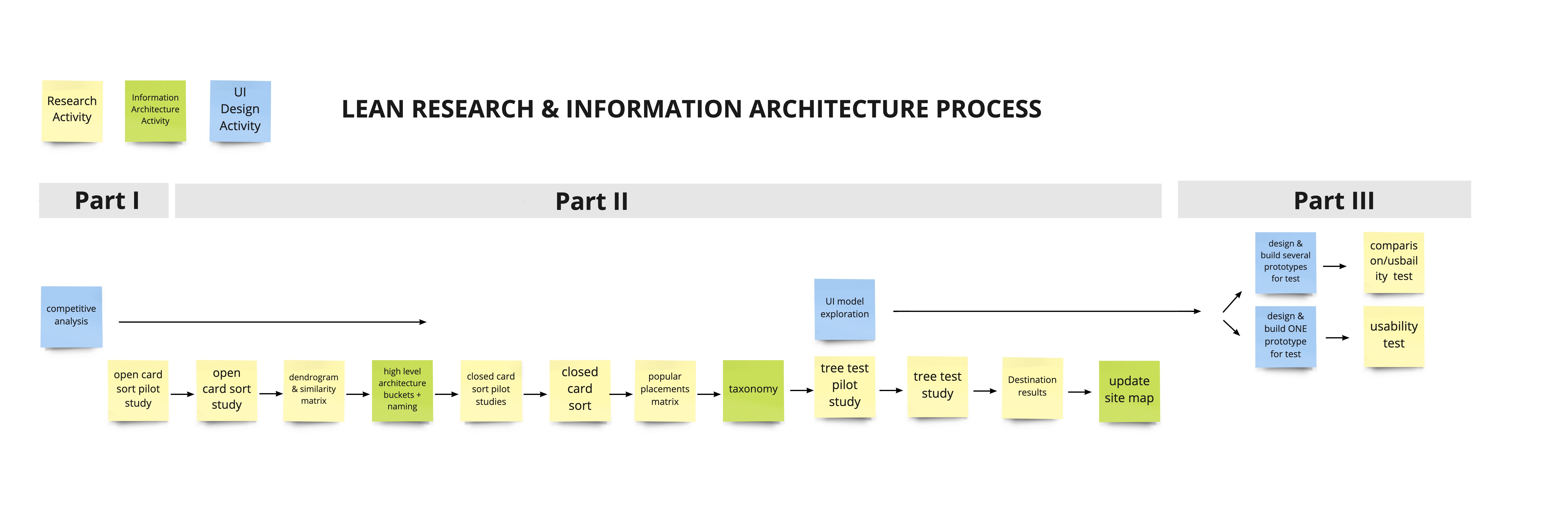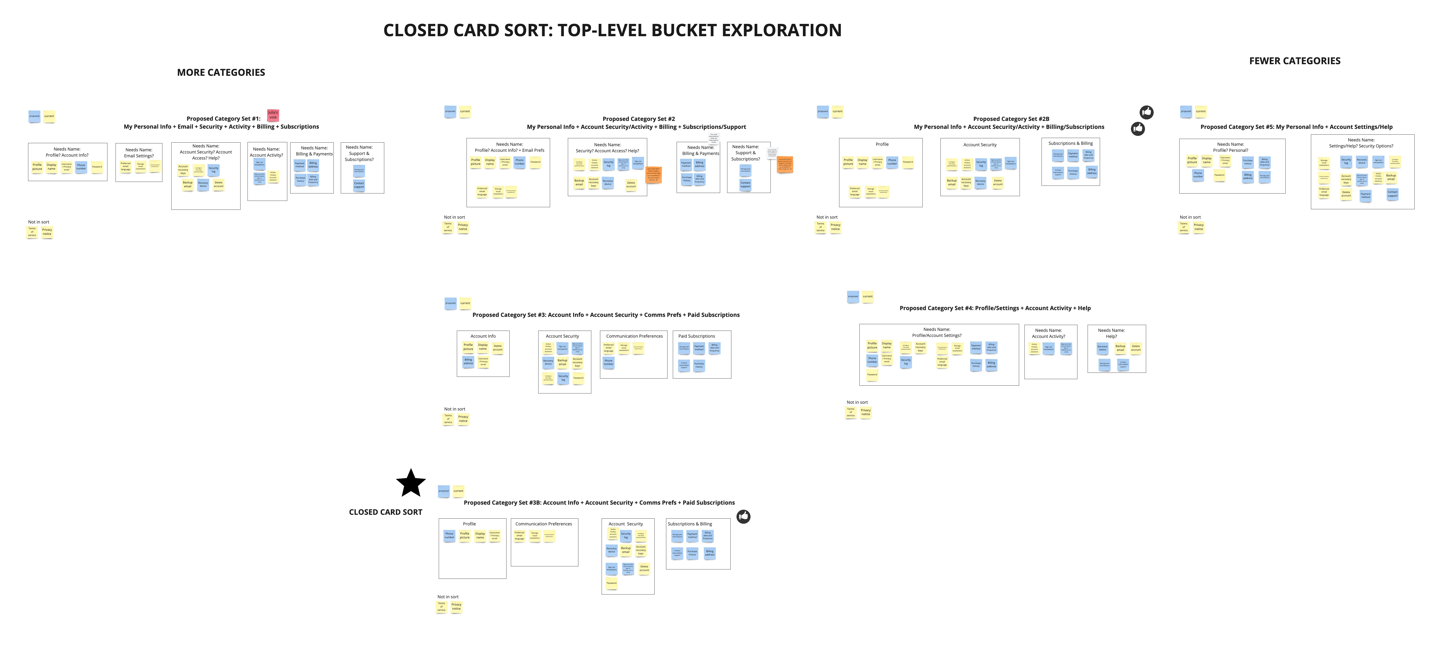 To prepare for the closed card sort, I worked with a content strategist to create labels for each card and then ran a workshop with members of the design team to design, iterate, and align on a proposed a high-level bucket and naming structure based on the output of the open card sort: