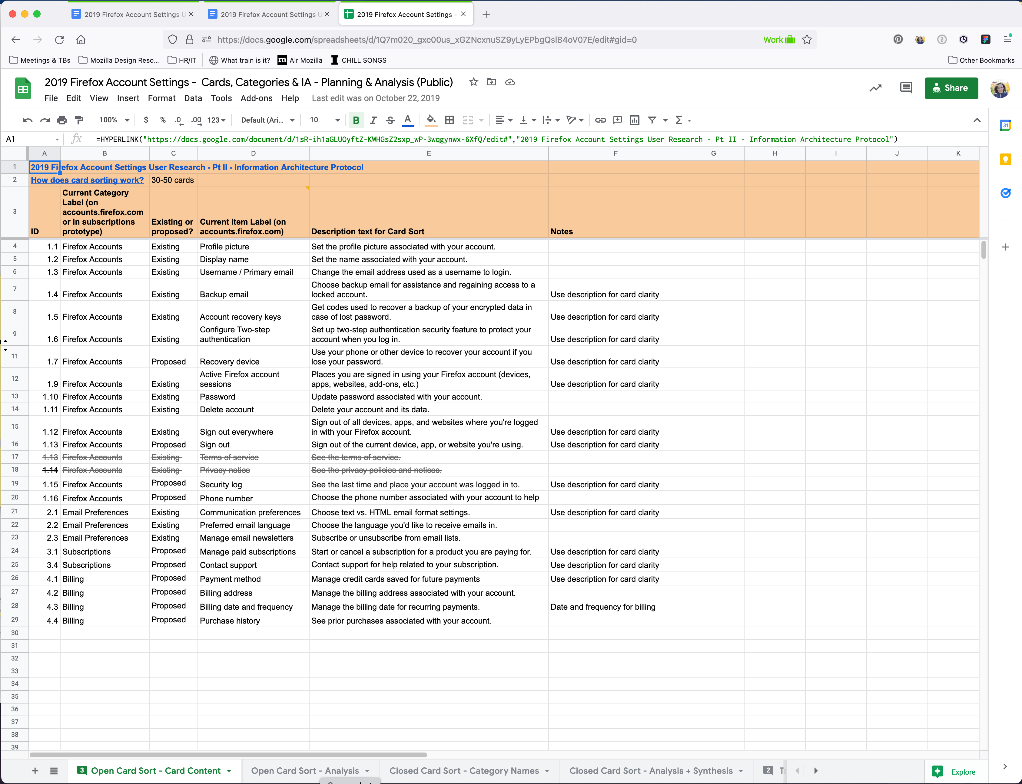 I began by conducting two rounds of card sorts to see how users thought about the various pieces of current and proposed content within the Firefox Account settings website. I invited the cross-functional team to give feedback on the description text for the open card sort before running the test in OptimalWorkshop.